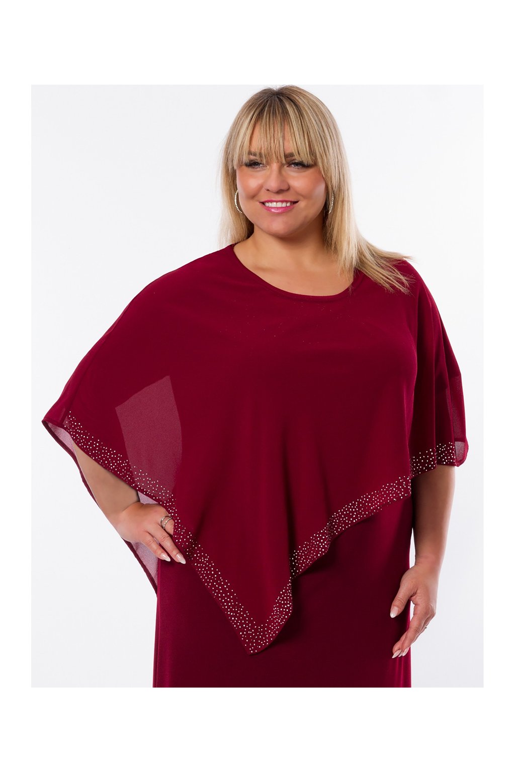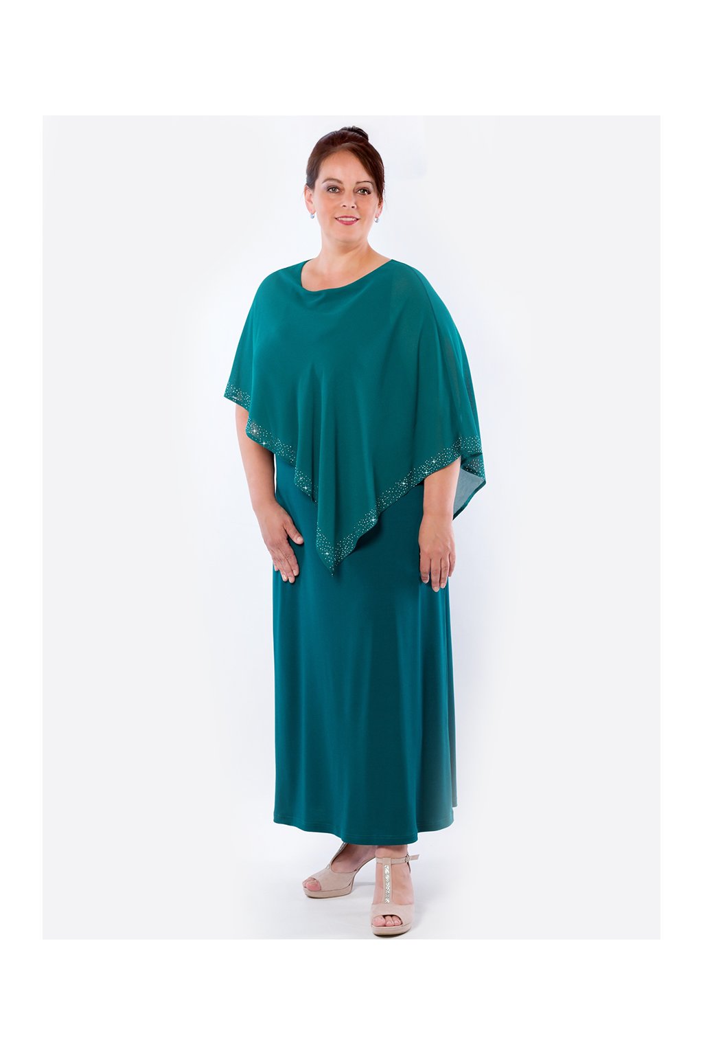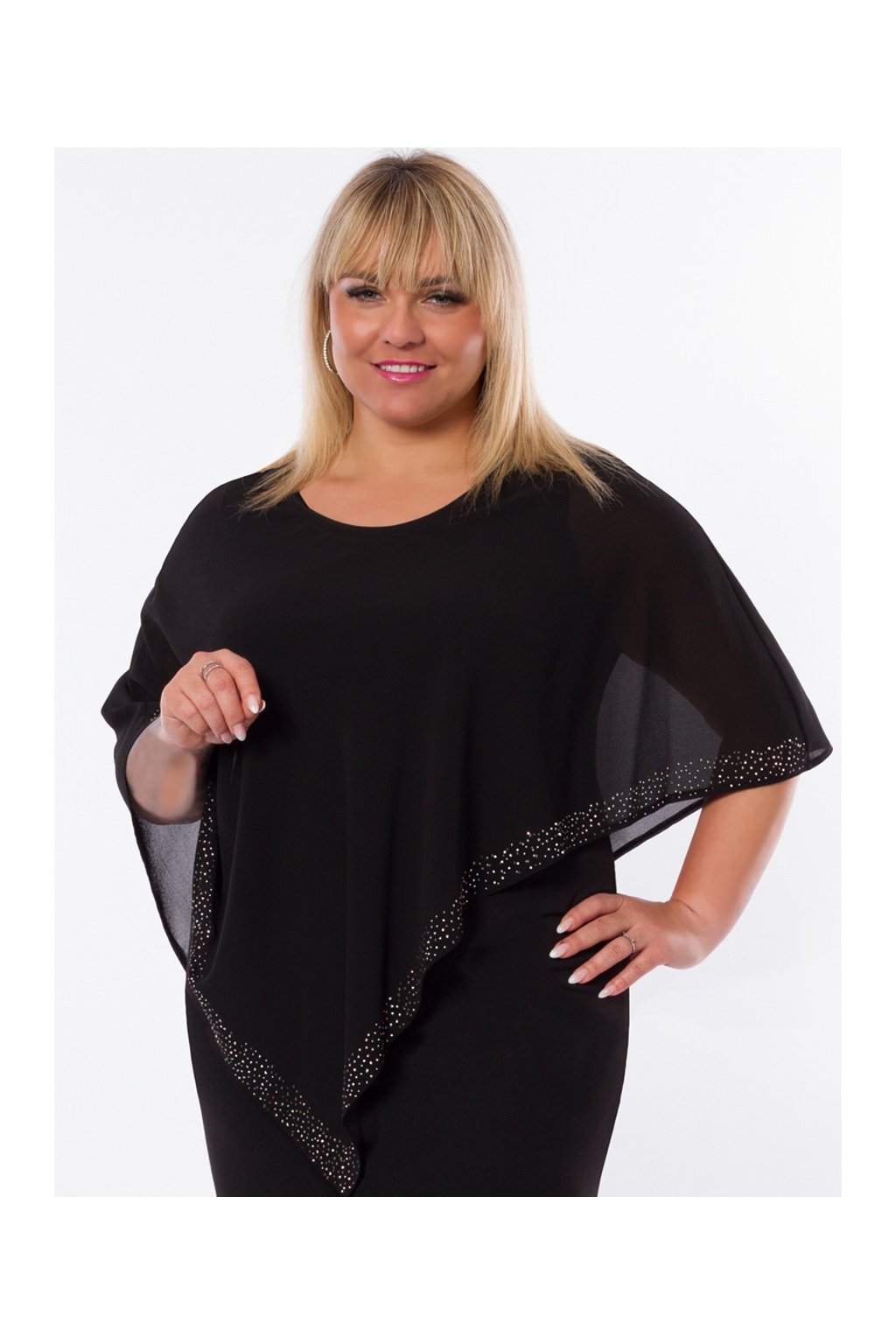 Dvouvrstvé společenské šaty skryjí nedostatky postavy, pro plnoštíhlé. Spodní část bez rukávů, pružná, rozšířená do "áčka". Asymetrický vrchní šifónový díl zdobený po celém spodním okraji kamínky. Vzdušný spadlý rukáv. Střih na vaši postavu i délku upravíme, napište nám vaše míry.