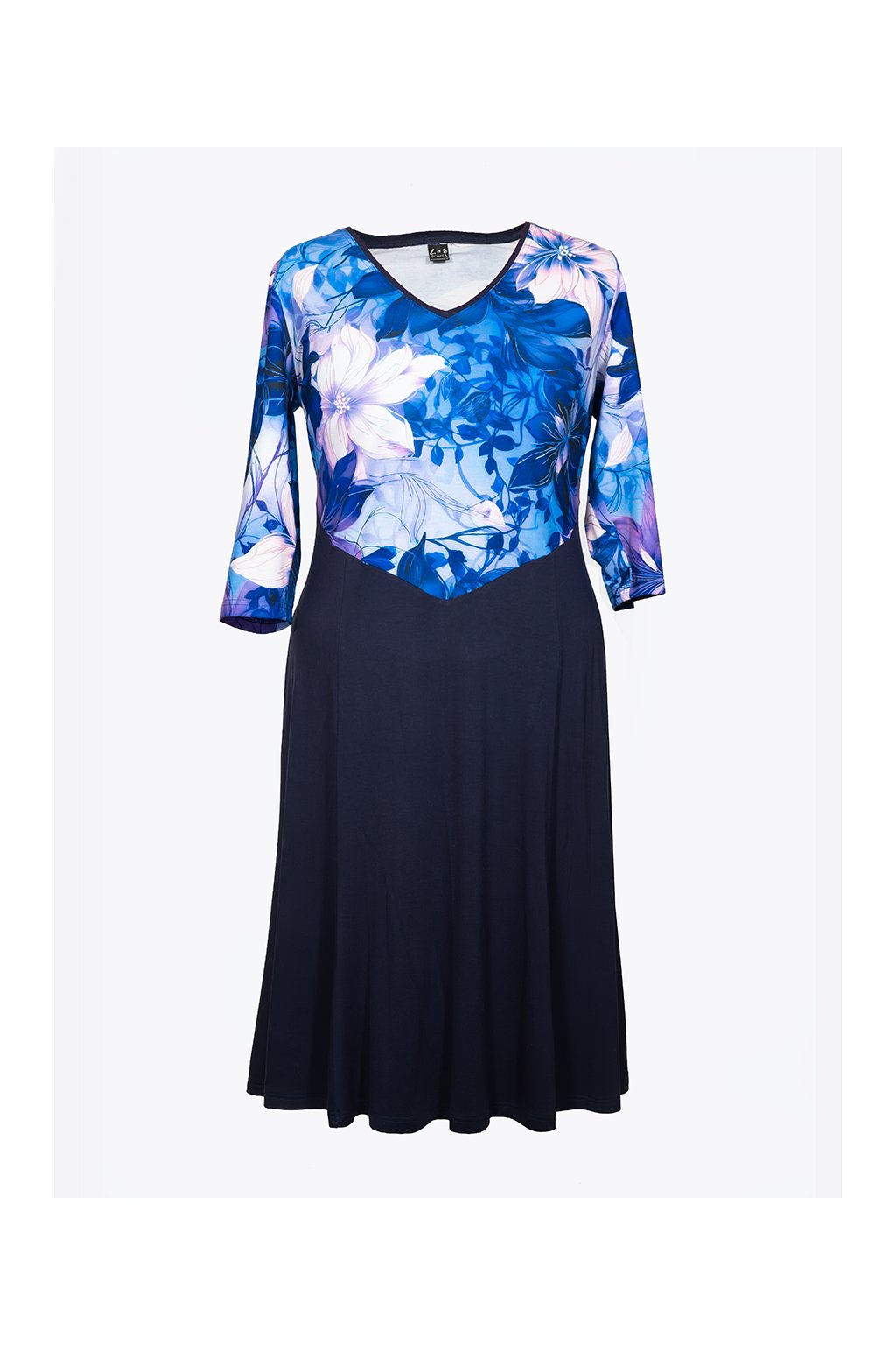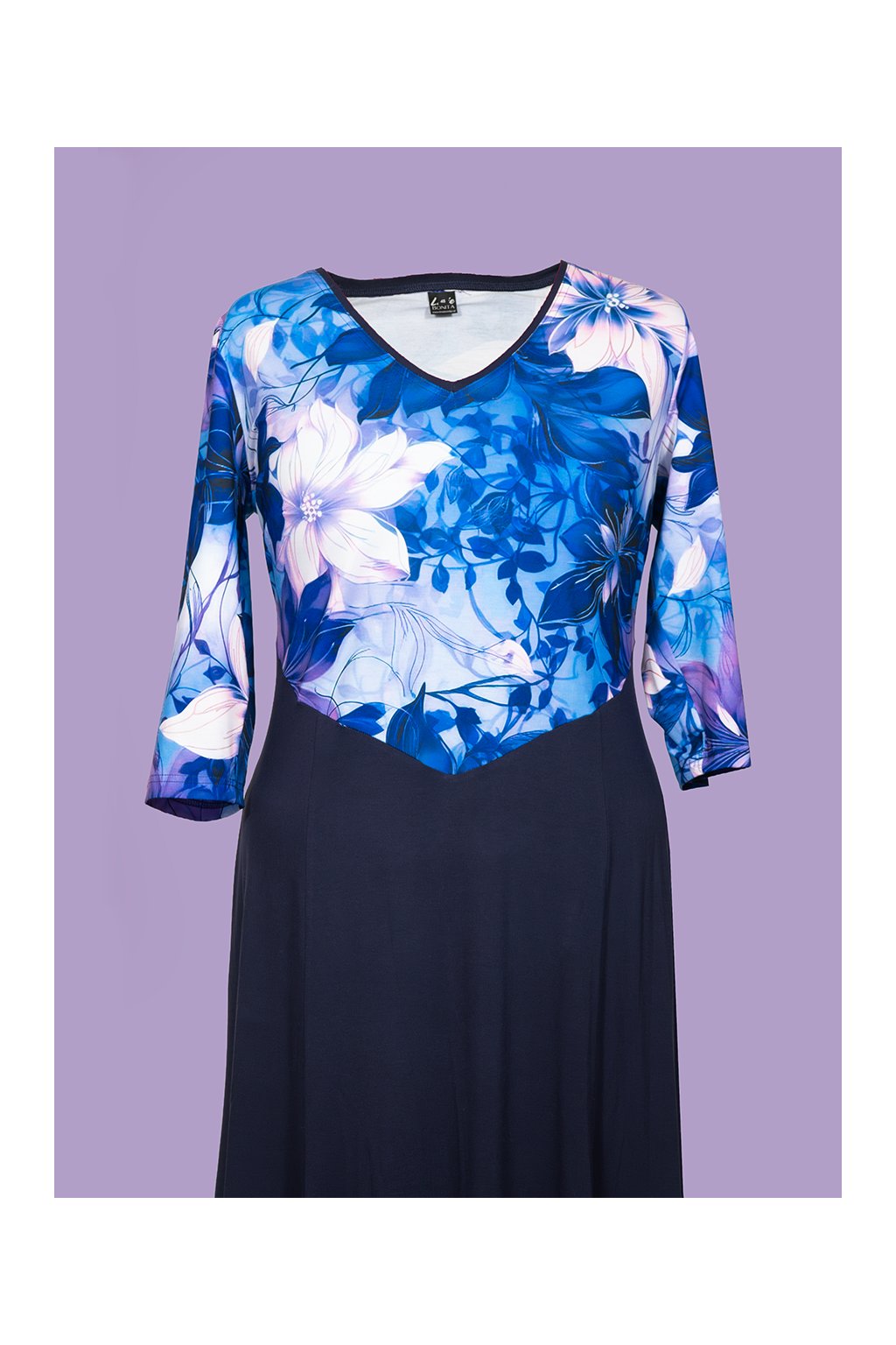 ESME šaty zaujmou na první pohled svým jemným a přitom výrazným vzorem v modro-fialových tónech. Kvítky a drobné lístečky vytvářejí harmonický, elegantní celek, který působí svěže, žensky a velmi vkusně.