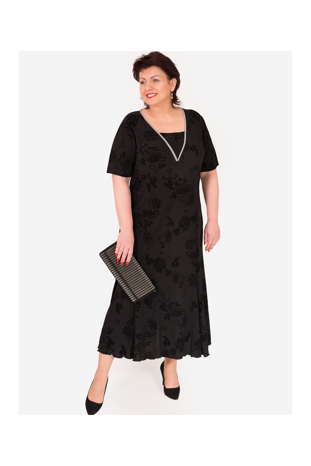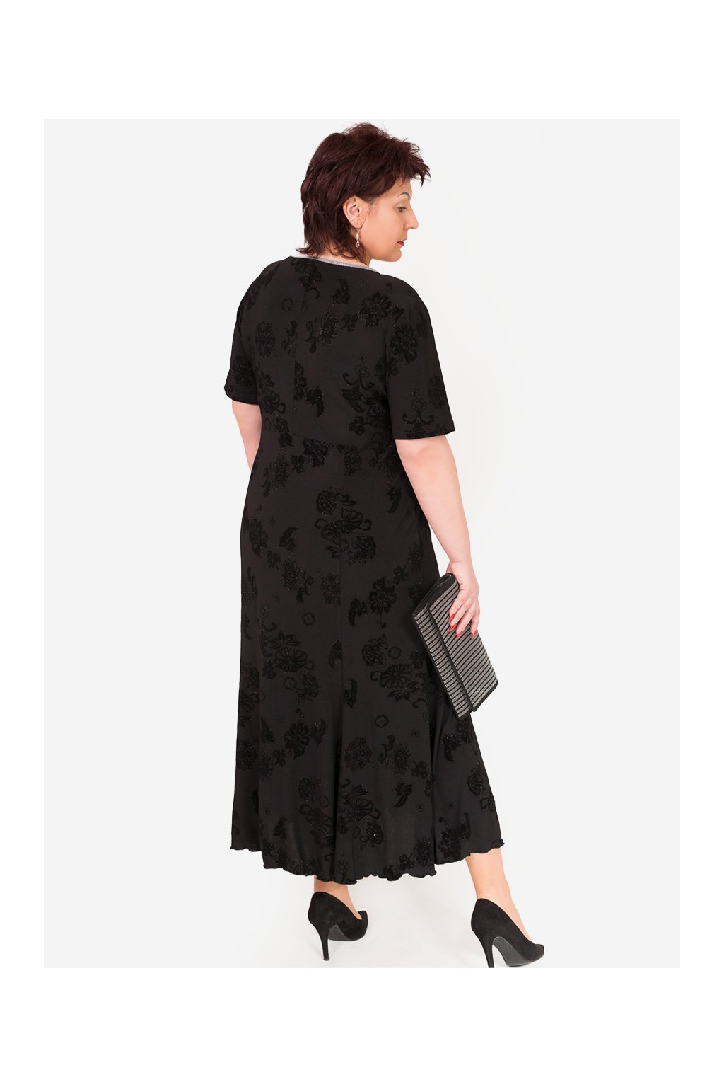 Společenské, večerní šaty, výstřih je zajímavě zdobený. Materiál pružný, nemačkavý, se sametovým vzorem.
