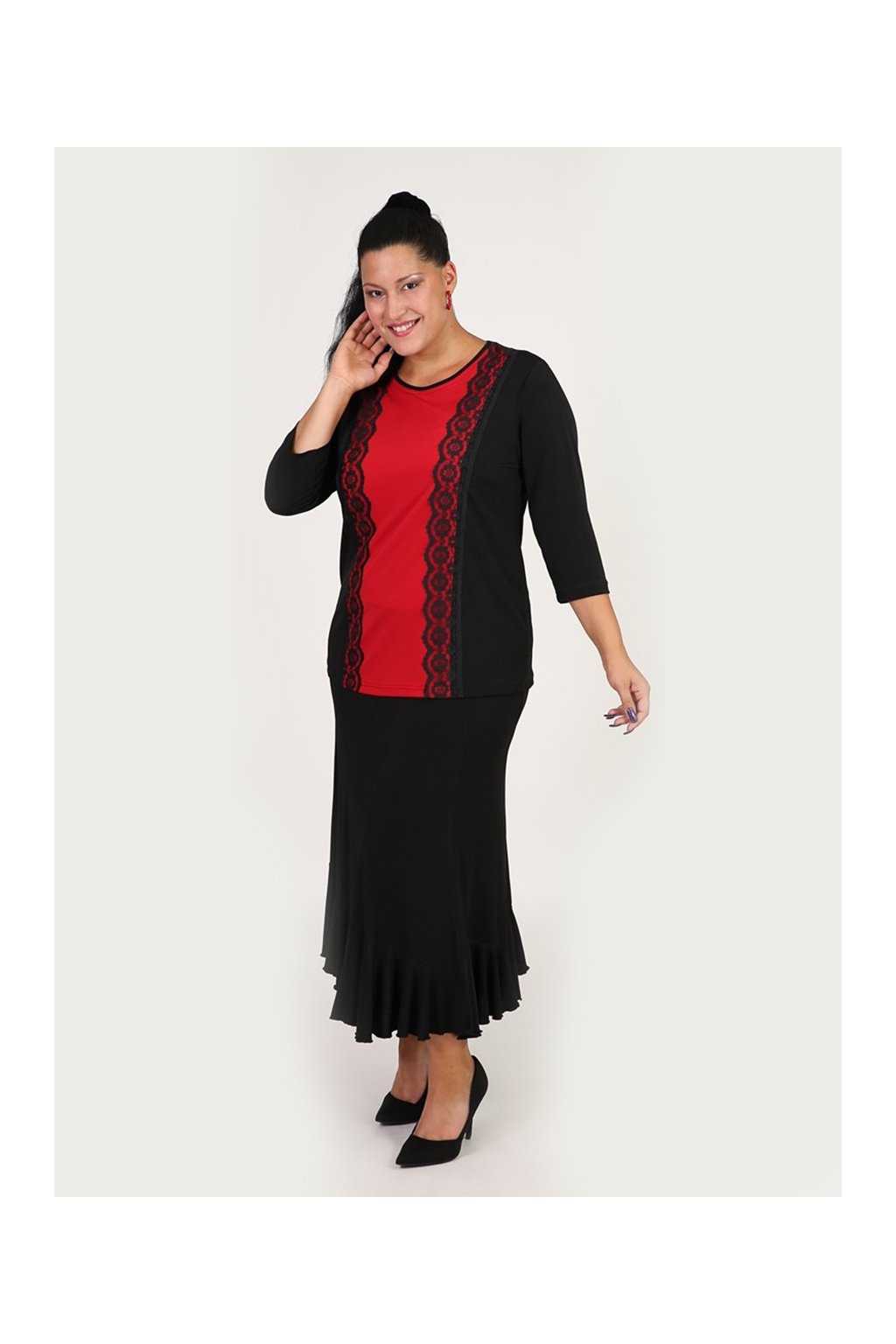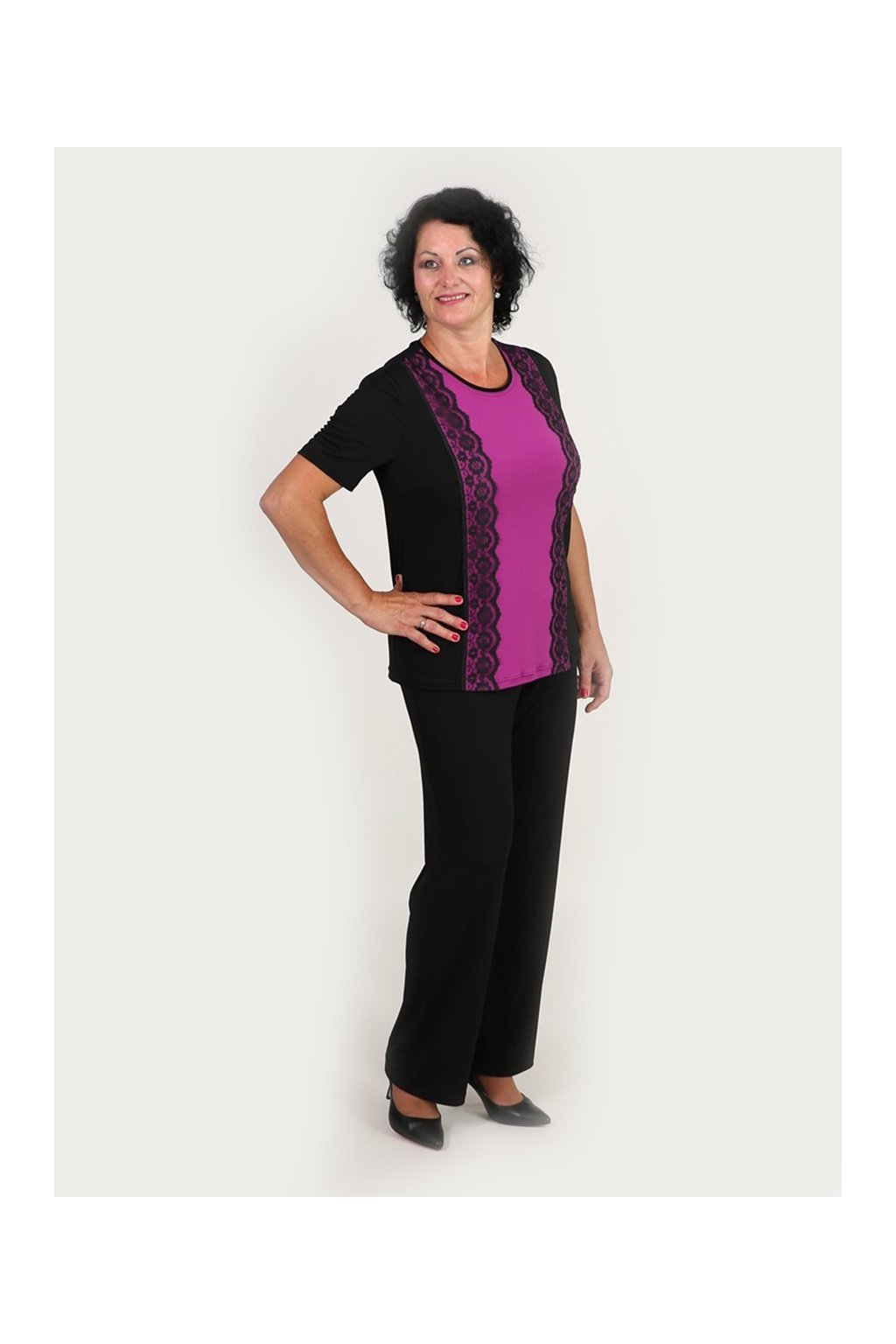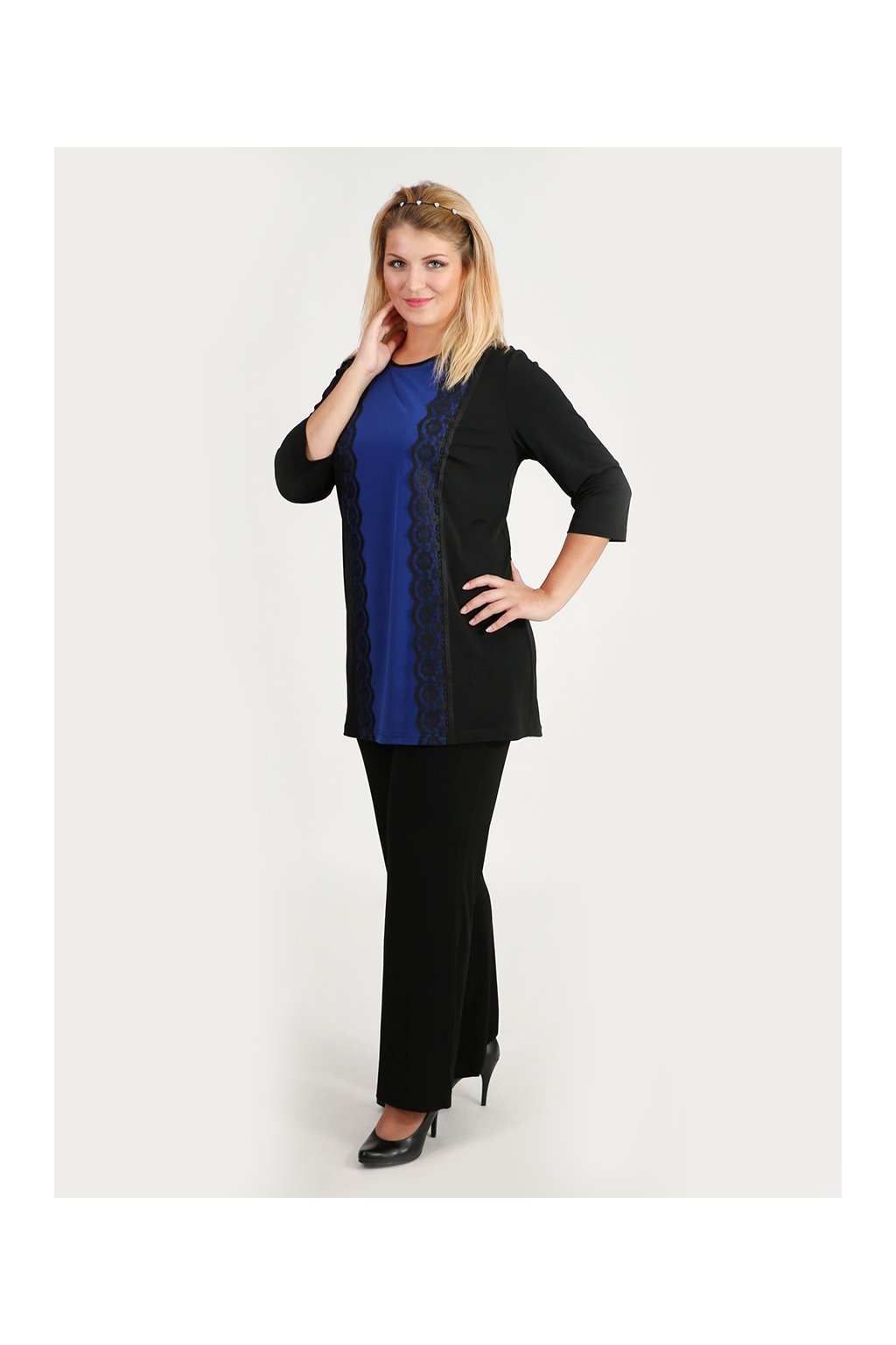 Hebká, příjemná, společenská i vycházková tunika, černé boky a černý zadní díl opticky zeštíhlí, přední díl zdobí našitá krajka a jednobarevný střední díl. Krátký nebo 3/4 rukáv. Můžete požádat o změnu výstřihu. Vhodná s kalhotami VALDA, KLASIK, ADAM aj. Střih na vaši postavu a délku ZDARMA upravíme, napište nám vaše míry.