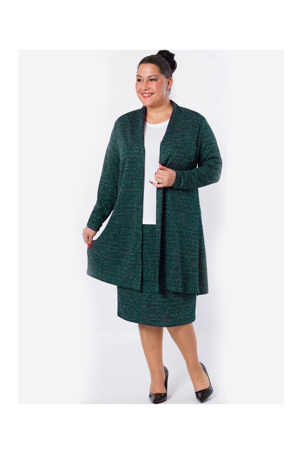 Jemný úplet se stříbřitou nitkou. Teplejší pouzdrová sukně v pase do pohodlné gumy, vzadu s malým rozparkem. Vyberte si střih bez podšívky nebo s podšívkou a svou délku. Ideální kostým od podzimu do jara vytvoříte s tunikou RONTA nebo s kardiganem REVAI. Střih i délku na vaši postavu ZDARMA upravíme. Napište nám vaše míry, aby sukně perfektně seděla.