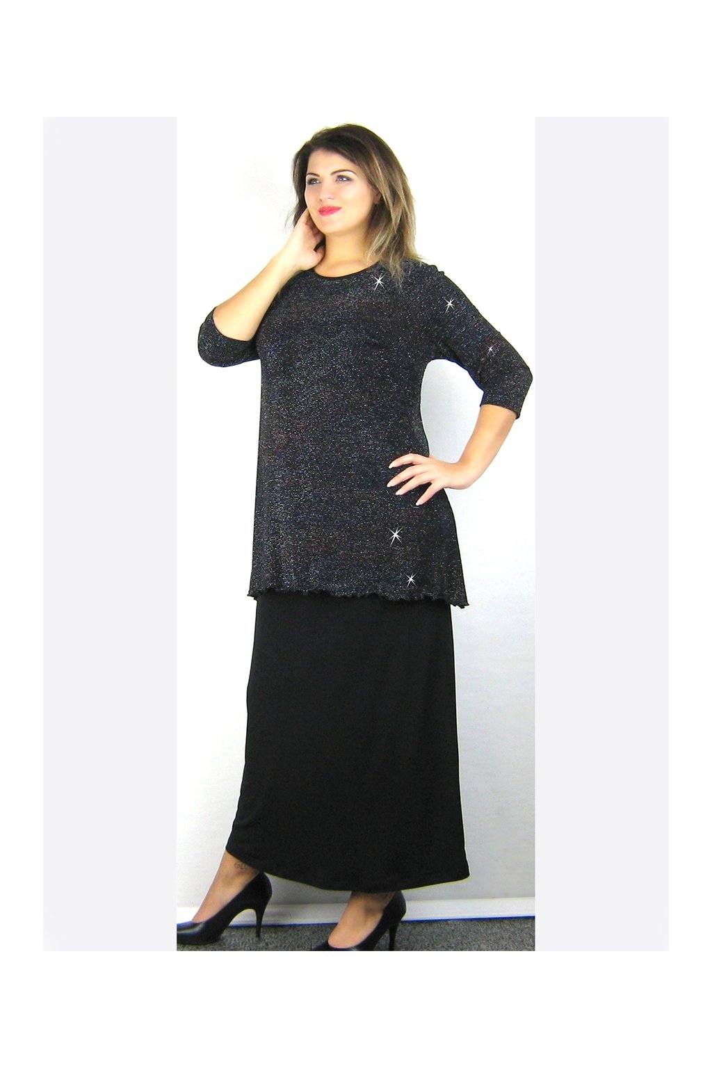 Společenská, splývavá tunika, rozšířená do "áčka", vhodná pro plnoštíhlé. Pružný materiál protkávaný jemnými lurexovými nitkami. Se sukní RADMILA získáte luxusní večerní kostým. Velmi příjemná na tělo, snadná údržba, stálobarevná, materiál "nekouše". Střih na vaši postavu a délku ZDARMA upravíme, napište nám vaše míry.