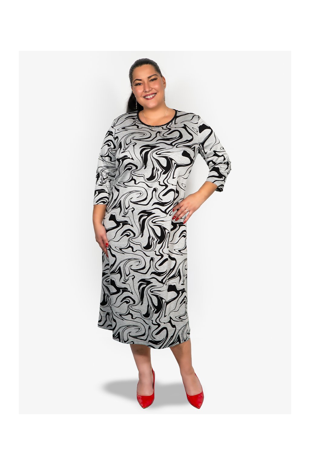Šaty z příjemného, teplejšího materiálu s velmi zajímavým vzorem, který opticky zakryje nedokonalosti postavy. Můžete si upravit výstřih (kulatý nebo do V), délku rukávu (3/4 nebo dlouhý) i celkovou délku šatů. Díky střihu na míru se v nich budete cítit pohodlně, sebejistě a zároveň elegantně.