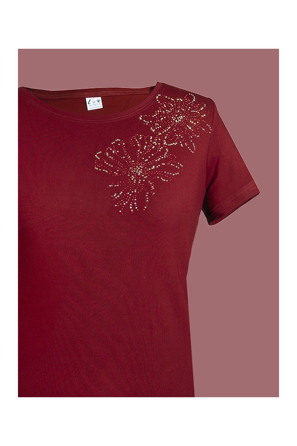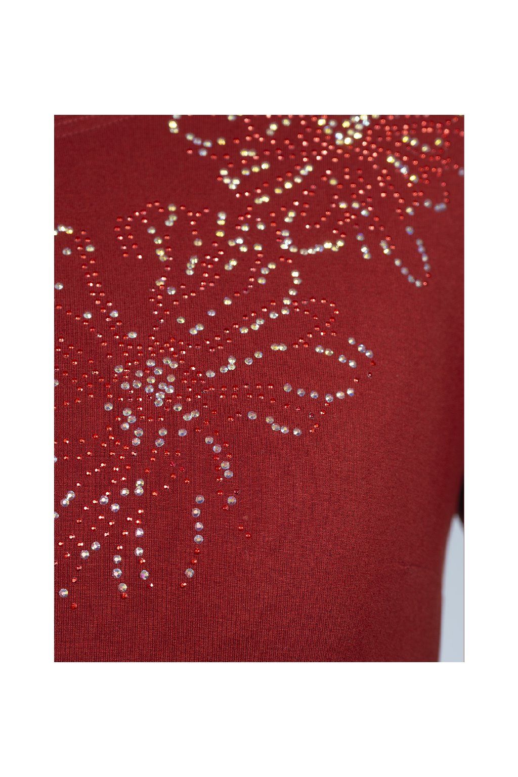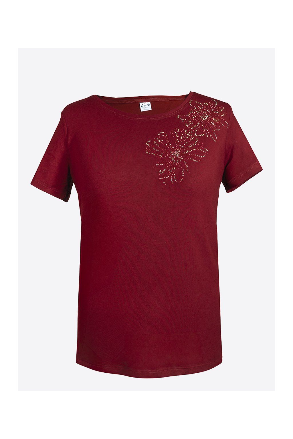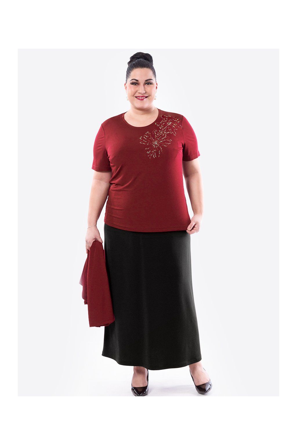 Společenská, pružná a velmi příjemná halenka. Přední díl zdobí elegantní aplikace kamínků v podobě květu, která v kombinaci červených a stříbrných tónů krásně vyniká na vínovém podkladu a dodává modelu jemný, slavnostní nádech.