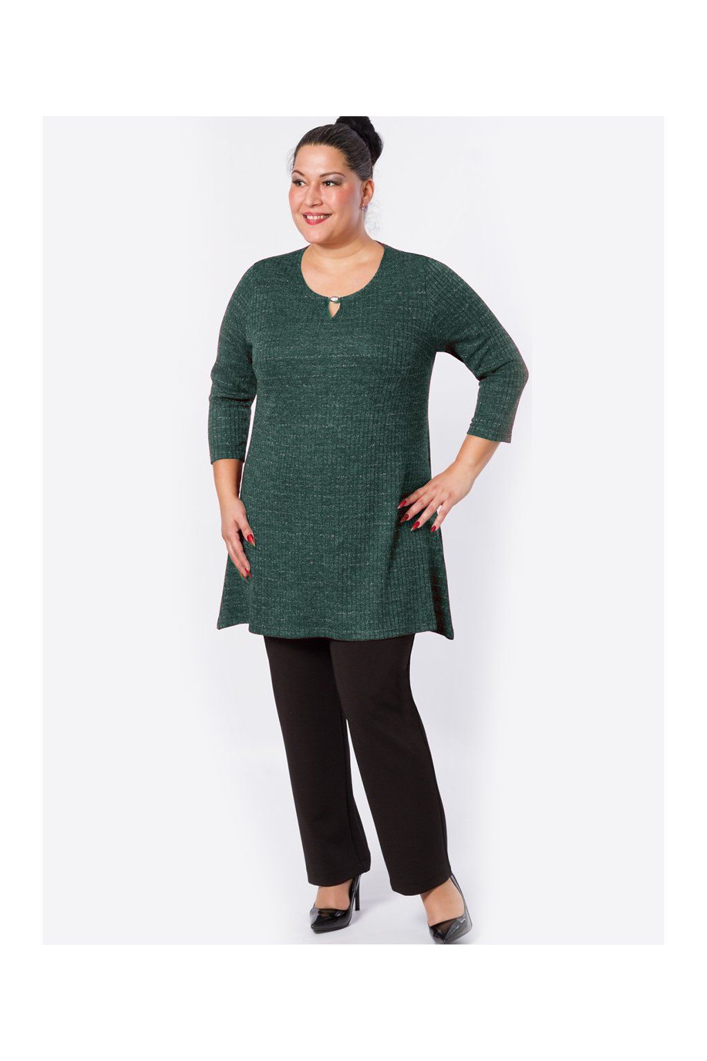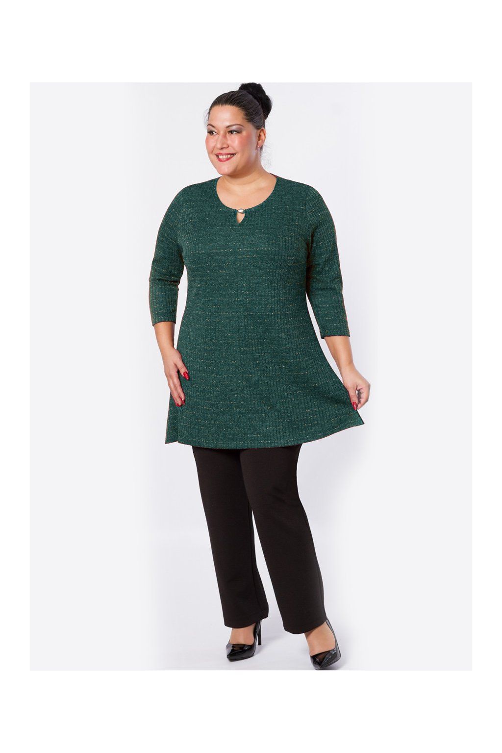 Elegantní vycházková tunika mírně do áčka, ve výstřihu s ozdobným detailem. Příjemný, teplejší, měkký žebrovaný úplet s jemnou sříbřitou nitkou. 3/4 nebo dlouhý rukáv. Skvostný kostým vytvoříte se sukní MIONA. Kombinujte s kalhotami Valda, Robert apod. Střih na vaši postavu a délku ZDARMA upravíme, napište nám vaše míry.